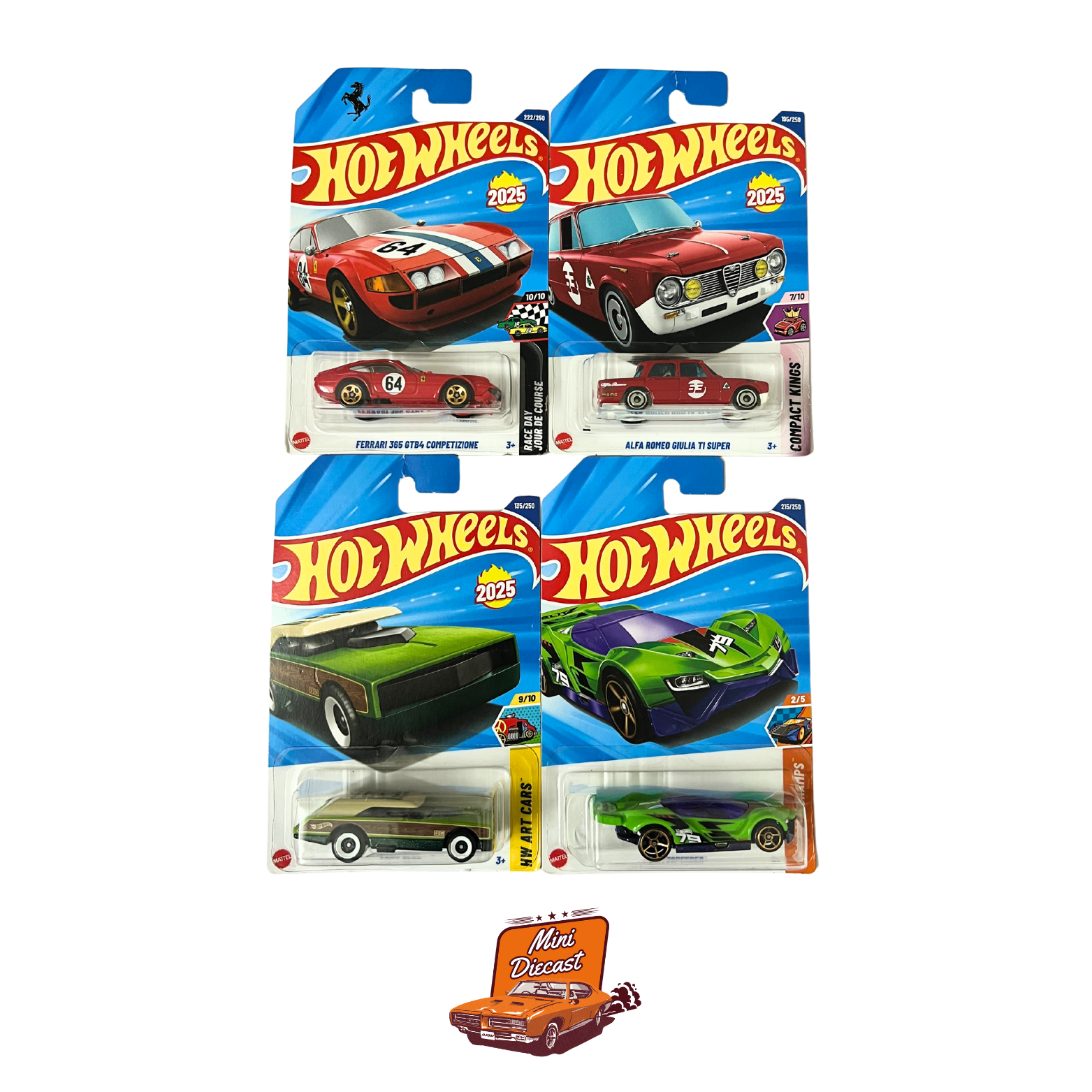 Hot Wheels Mainline (Set of 4) – Ferrari 365 GTB4 Competizione / Alfa Romeo Giulia TI Super / Long Bloc / Blitzspeeder