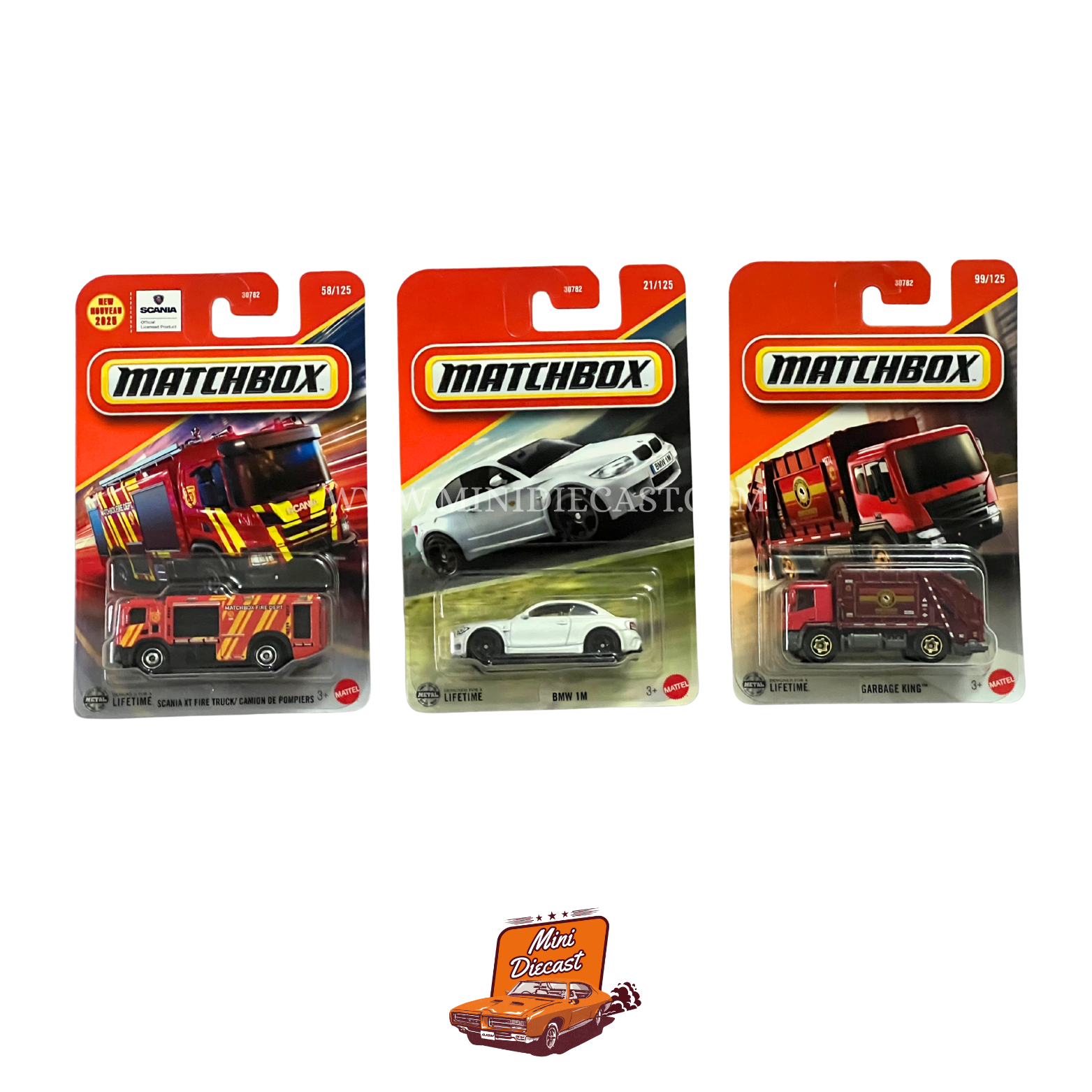Matchbox (Set of 3) – Scania XT Fire Truck / BMW 1M / Garbage King